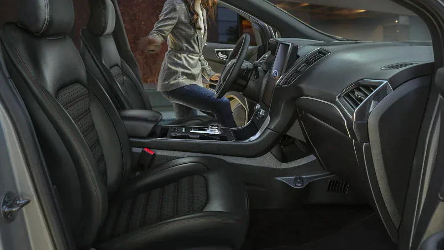 The 2022 Ford edge ST interior features door-sill scuff plates, a unique metallic pedal, as well as front and rear carpeted floor mats.